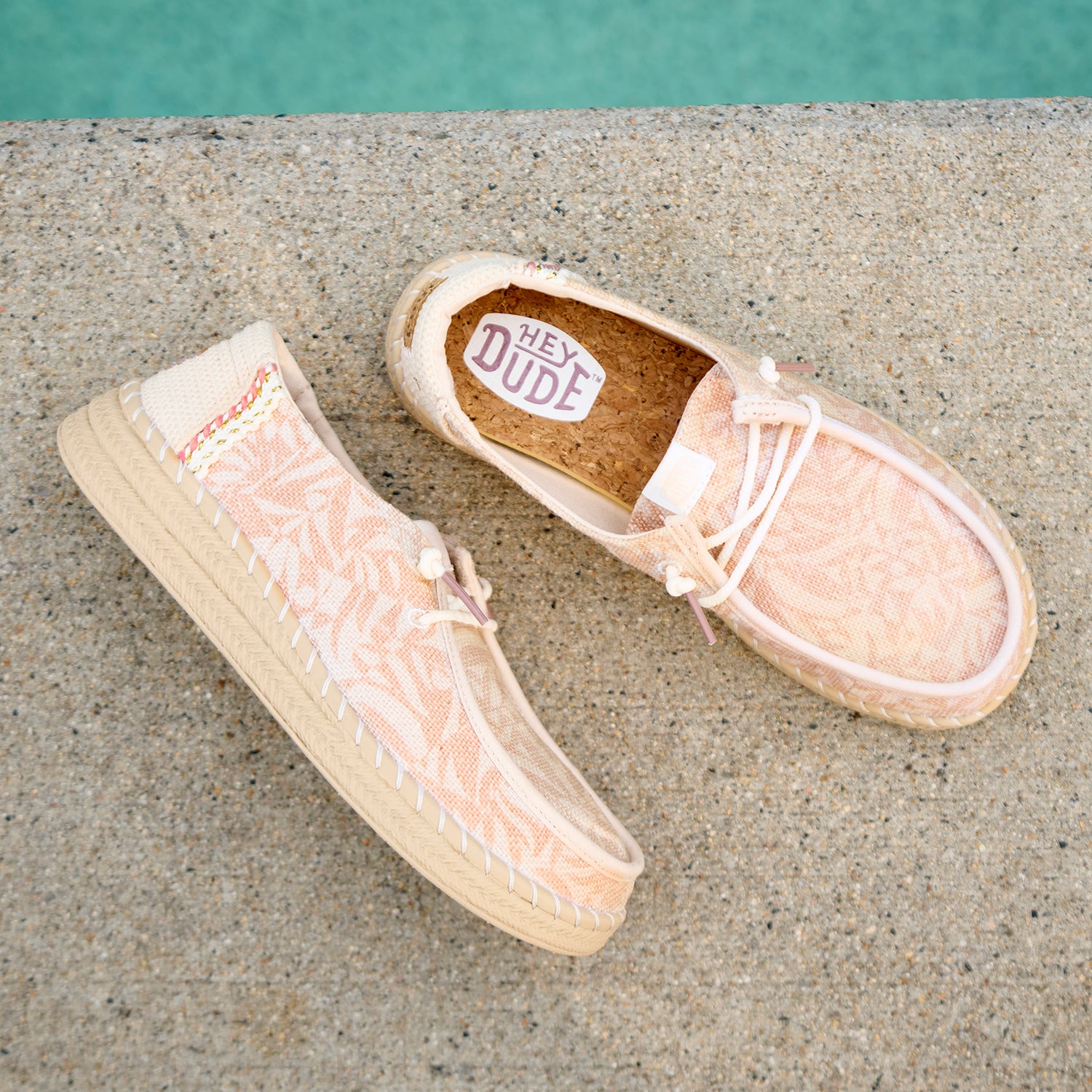 La playa te llama, y tenemos la respuesta: WENDY ESPADRILLE RETRO PALM. Estas nuevas compañeras presentan un paraíso de palmeras estampado en la parte superior de su tejido, y una fresca suela moldeada inspirada en las alpargatas, que te acompañarán cómodamente a un tranqilo paseo al atardecer, en incluso hasta el bar de la playa.